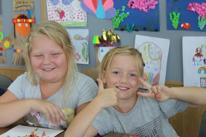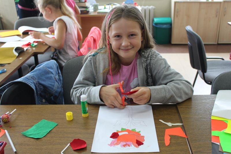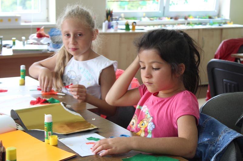 – Dziś robimy kwiatki, które losowaliśmy, żeby było sprawiedliwie. Trzeba uważać, by nie wyjść za linię tych szkiców. Nie można ich zakleić, bo byłoby nieładnie. Trzeba być dokładnym, schludnym i dobrze dobierać kolory. Wzięłam czerwony i pomarańczowy. Na zajęciach można się dużo nauczyć i robić niektóre rzeczy pierwszy raz, np. jak się robi lalkę z Japonii – mówi 7 – letnia Karolina z Przylesia, która na zajęcia przyszła z kuzynką Niną, sześciolatką. – Zrobiłam tulipana z papieru samoprzylepnego i filcu. Przychodzę tu, bo jest fajnie. Robiliśmy już pawie i inne rzeczy. takie wakacje są ciekawsze. – dodaje Nina