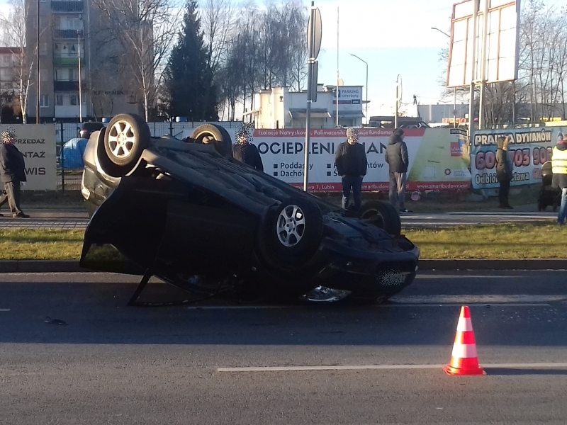 Po godzinie 14 na ulicy Hutniczej doszło zderzenia dwóch samochodów. Z ul. Krupińskiego (podporządkowana) wyjeżdżał volkswagen polo. Kierujący nim mężczyzna nie zachował ostrożności i uderzył w bok przejeżdżającej ulicą Hutniczą toyoty. Zderzenie doprowadziło do dachowania toyoty.