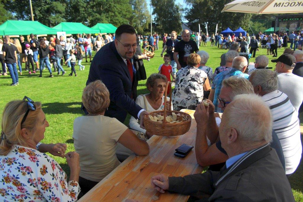 Symbolicznego dzielenia chleba burmistrz dokonał wspólnie z Mariuszem Zybaczyńskim, wiceprzewodniczącym Rady Miejskiej w Polkowicach oraz Heleną Woźniak, radną miejską. Następnie chleb został rozdany uczestnikom dożynek, na dobrą wróżbę, aby nikomu go nie zabrakło przez cały rok. O potrzebie wspólnego świętowania dożynek i dziękczynienia za plony mówiła także radna Helena Woźniak. Zwróciła uwagę, że w tak przemysłowym regionie jak nasz, nadal żywa jest tradycja rolnicza i hodowlana.