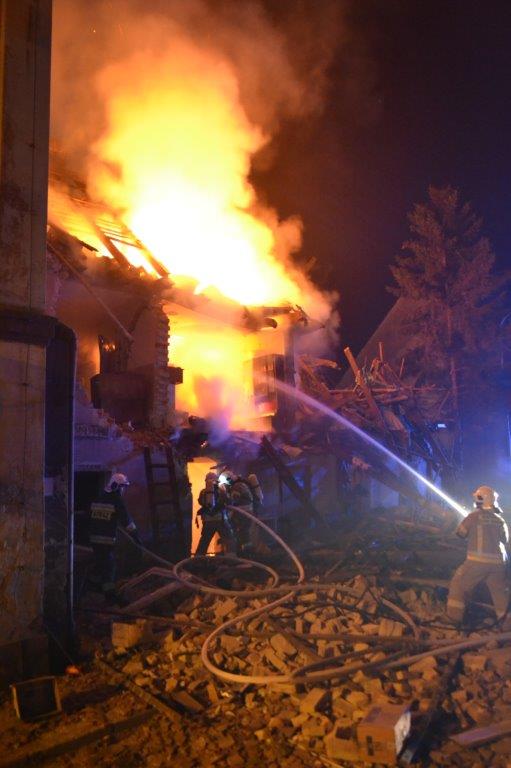 Przed godziną 22 strażacy spenetrowali parter budynku nie natrafiono tam na nikogo. Akcja jest utrudniona, gdyż cały czas ulatnia się gaz, a cały dom od strony ulicy zamienił się w ruinę.