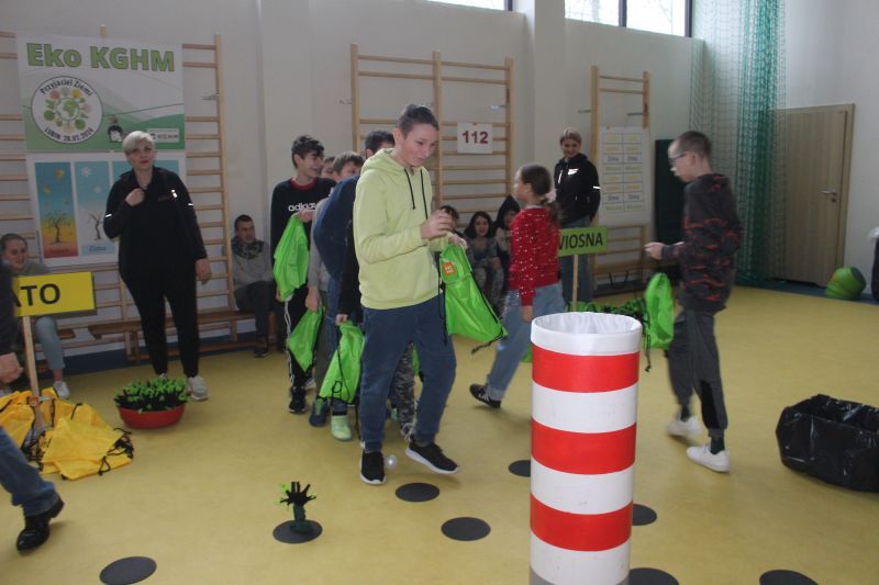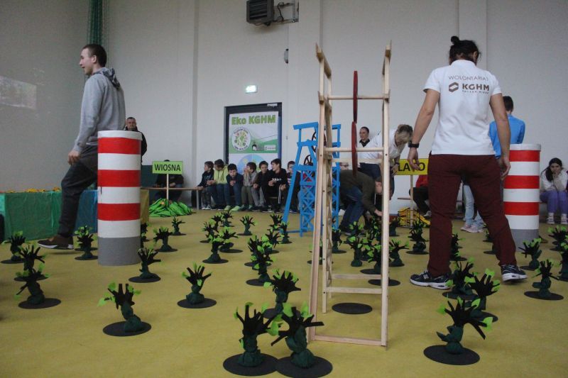 W sali gimnastycznej przygotowano mnóstwo stanowisk a przy nich wolontariusze KGHM, którzy poprzez zabawę i działania uczyli dzieci z SOSW w Lubinie jak żyć z myślą o środowisku.