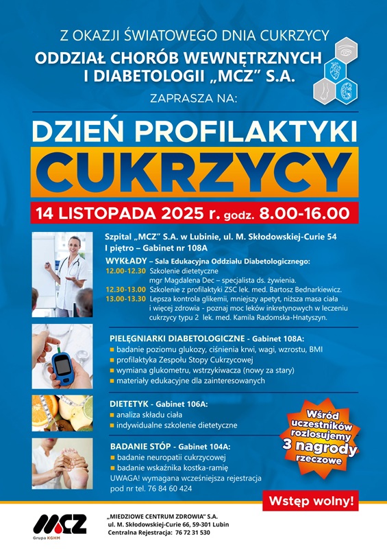 Z okazji Światowego Dnia Cukrzycy Oddział Chorób Wewnętrznych i Diabetologii zaprasza do Szpitala “MIEDZIOWEGO CENTRUM ZDROWIA” S.A. w Lubinie na szereg badań. 14 listopada od godziny 8.00 do 16.00 będzie m.in. szkolenie dietetyczne, badanie stóp, poziomu glukozy, ciśnienia krwi, wagi, wzrostu czy BMI.