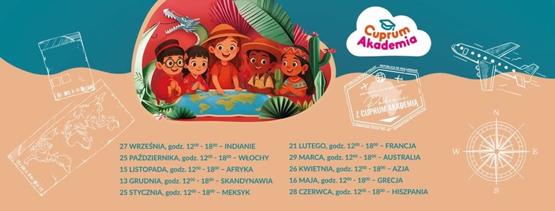 Cuprum Akademia – Mali podróżnicy to niezwykła podróż dookoła świata dla najmłodszych. Organizatorzy zapraszają wszystkie dzieci na cykl bezpłatnych, wyjątkowych spotkań, podczas których poznają ciekawostki z różnych zakątków globu. Tym razem będzie to Afryka. W Galerii Cuprum Arena w Lubinie przy ul. Sikorskiego 15 listopada od godz. 12:00 do 18:00 na dzieci czeka przygoda pełna zabawy, nauki i kreatywnych warsztatów! Kolejne odsłony to 13 grudnia – Skandynawia, 25 stycznia – Meksyk, 21 lutego – Francja, 29 marca – Australia, 26 kwietnia – Azja, 16 maja – Grecja a 28 czerwca – Hiszpania.