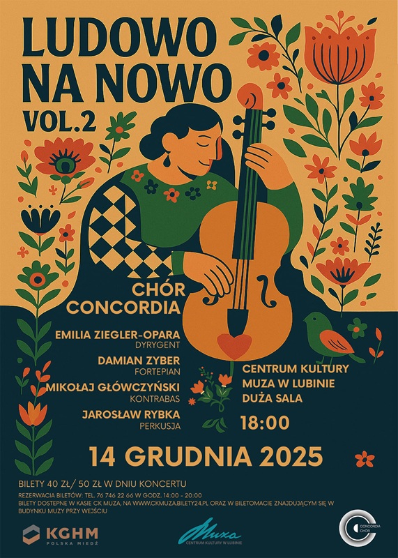 W zeszłym roku można było usłyszeć wspólny występ chóru Concordia z Leszkiem Możdżerem, który zaproponował wykonanie znanego utworu „Ameno” i tym razem nie zabraknie w Dniu Kurtyny muzyki chóralnej. CK Muza zaprasza na wyjątkowy koncert Concordii z udziałem zespołu instrumentalnego. Projekt powstał z inicjatywy Emilii Ziegler-Opary – dyrygentki chóru działającego przy CK MUZA, a także jednego z chórzystów i perkusisty zespołu Lub Jazztet – Jarosława Rybki. „Ludowo na nowo Vol. 2” to koncert, podczas którego chór Concordia zaprezentuje muzykę ludową z różnych regionów Polski. Wśród nich usłyszymy utwory stworzone specjalnie na to wydarzenie. Za aranżacje chóralne odpowiada Emilia Ziegler-Opara, natomiast o warstwę instrumentalną zadba Damian Zyber – pianista jazzowy i aranżer. Artystom chóru będzie towarzyszyć zespół instrumentalny w składzie: Damian Zyber (fortepian), Jarosław Rybka (perkusja), Mikołaj Główczyński (kontrabas).