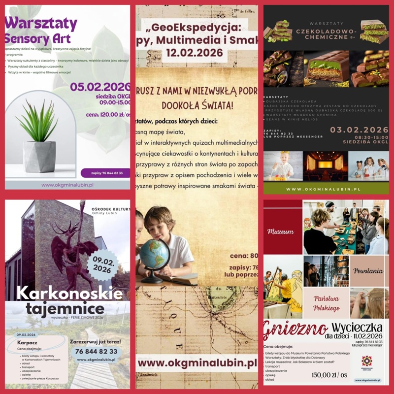 Jak co roku Gminny Ośrodek Kultury Gminy Lubin przygotował wyjątkowy, bogaty program ferii, pełen twórczych warsztatów, muzycznych atrakcji, sensorycznych odkryć oraz ekscytujących wyjazdów. To idealna propozycja dla wszystkich, którzy chcą spędzić zimową przerwę w inspirujący sposób.