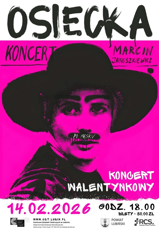 Centrum Działań Twórczych w Lubinie zaprasza na wyjątkowy koncert walentynkowy „Osiecka po męsku” w wykonaniu Marcina Januszkiewicza – artysty, który odważnie, a jednocześnie z ogromnym wyczuciem interpretuje twórczość Agnieszki Osieckiej. Wydarzenie odbędzie się 14 lutego o godz. 18.00. Koncert jest biletowany. Liczba miejsc ograniczona.